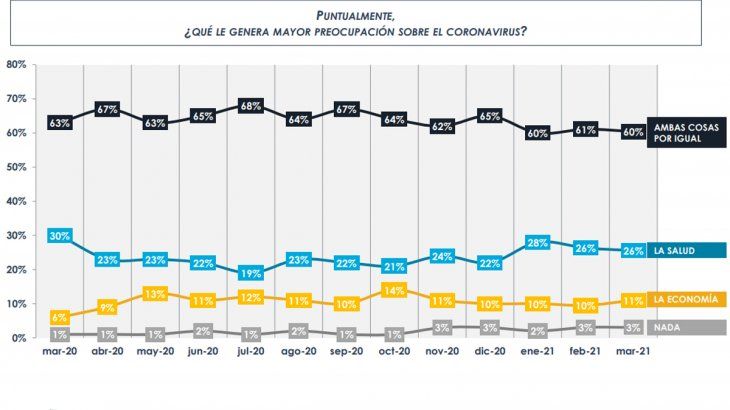 En cuanto a la mayor preocupación de los encuestados sobre el coronavirus, el 60% aseguró que es la economía y la salud. En un desagregado, el marzo el 26% advirtió sobre la salud y el 11% sobre la economía. Hace un año el combo era 63%: Salud (30%) y economía 6%.