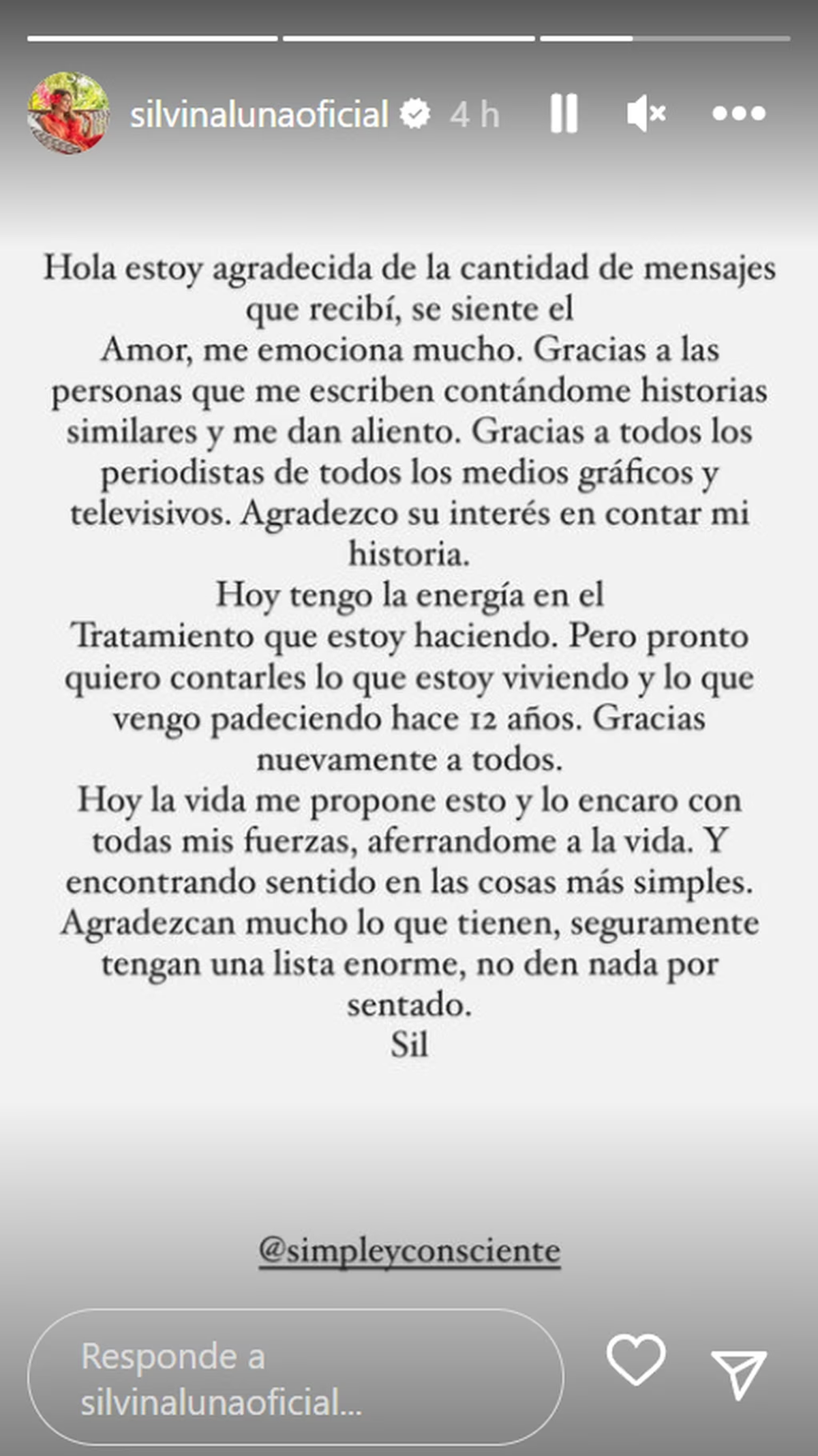 “Hola, estoy agradecida de la cantidad de mensajes que recibí, se siente el amor, me emociona mucho. Gracias a las personas que me escriben contándome historias similares y me dan aliento. Gracias a todos los periodistas de todos los medio gráficos y televisivos. Agradezco su interés en contar mi historia. Hoy tengo la energía en el tratamiento que estoy haciendo”, escribió en el posteo.