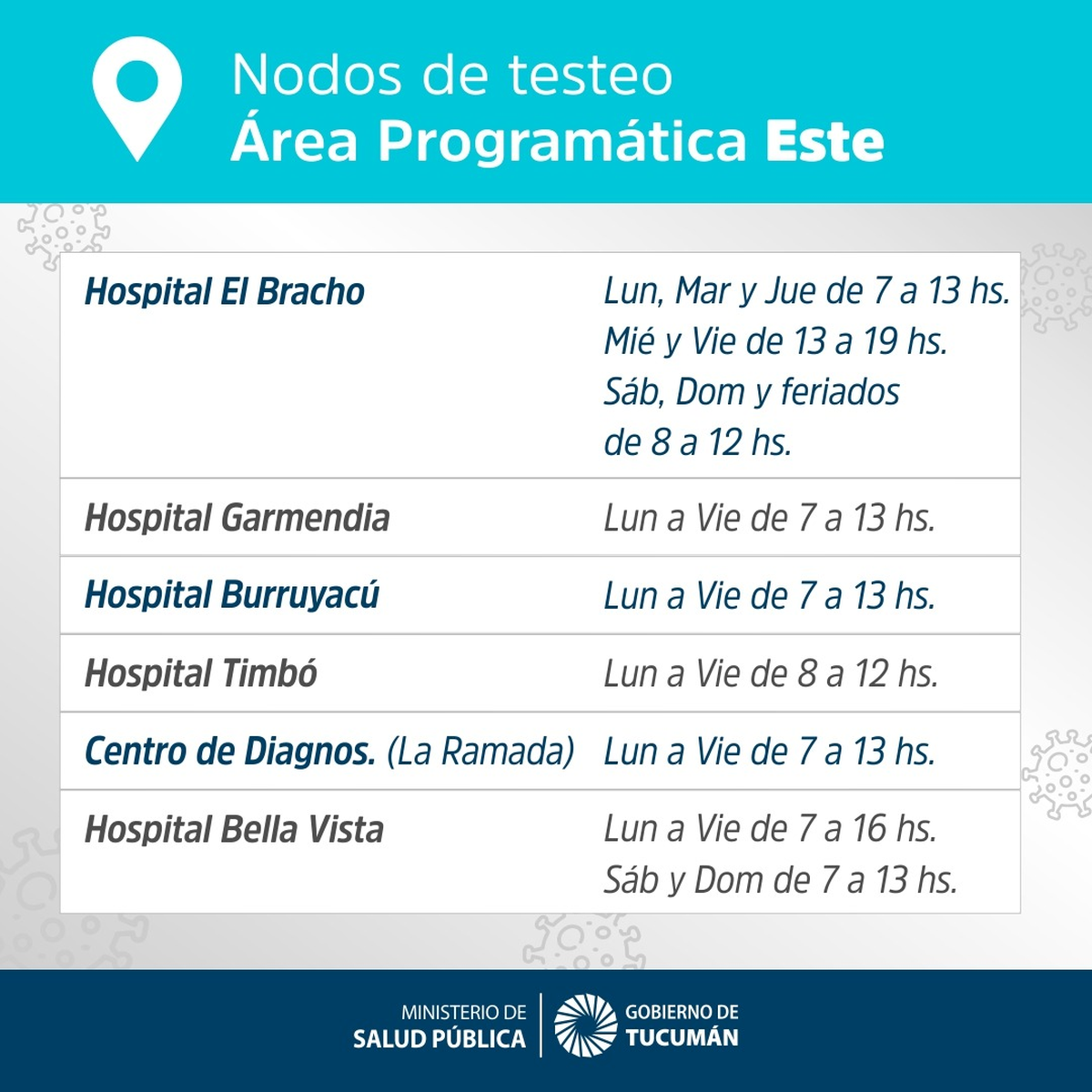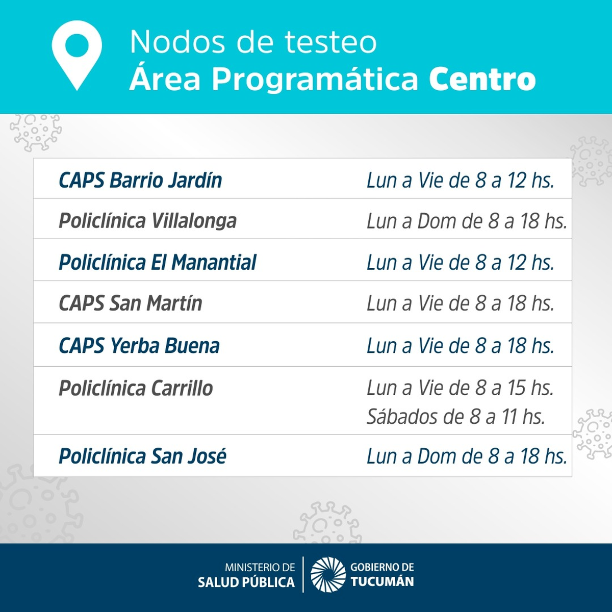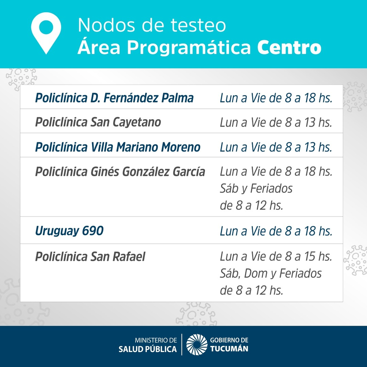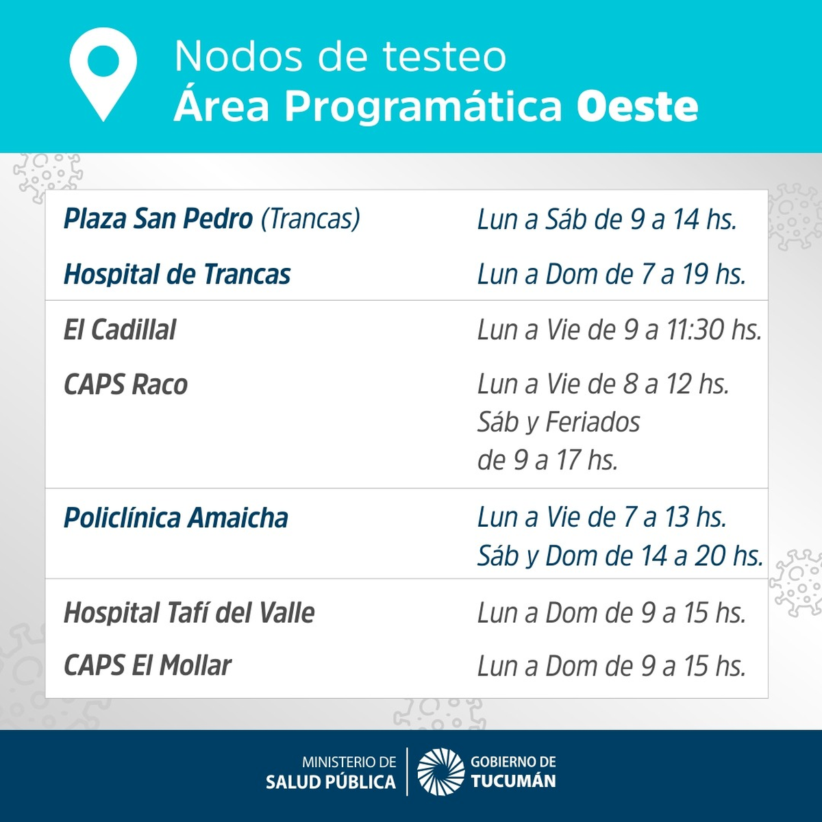 Ante el aumento de casos por la ola de Covid-19, que deriva a un alta demanda de testeos, la cartera de salud armó un cronograma de atención, el cual incluye los fines de semana, en cada nodo de Tucumán.