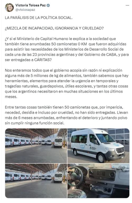Victoria Tolosa Paz expresó su indignación en su perfil de X: “La parálisis de la política social. ¿Mezcla de incapacidad, ignorancia y crueldad? ¿Y si el Ministerio de Capital Humano le explica a la sociedad que también tiene arrumbadas 50 camionetas 0 KM que fueron adquiridas para asistir las necesidades de los Ministerios de Desarrollo Social de cada una de las 23 provincias argentinas y del Gobierno de CABA, y para ser entregadas a CÁRITAS?”.