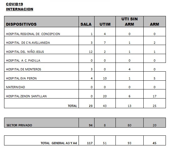 La Cocha | 208 Según los últimos datos sobre internaciones brindados por el Ministerio de Salud provincial, encabezado por la doctora Rossana Chahla, son 306 los tucumanos con Coronavirus internados en hospitales y sanatorios: 104 en el sector público y 202 en el privado. Por otro lado, se indica que son 45 los pacientes con asistencia respiratoria mecánica (ARM).