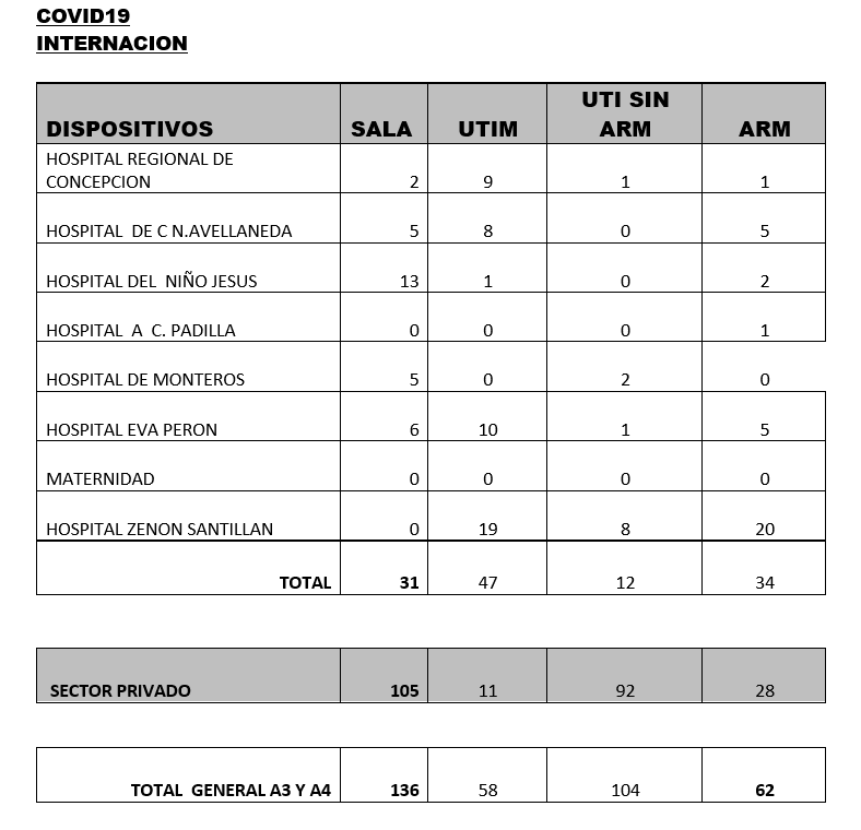 Asimismo, se informa el fallecimiento de 3 pacientes, de los cuales 1 estaba siendo asistido en el sector privado y 2 en el público: -Un hombre de 81 años con comorbilidades, internado en terapia intensiva del sector privado, en asistencia respiratoria mecánica, con neumonía por Covid-19.