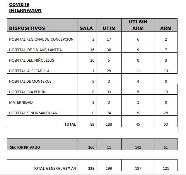 Asimismo, se informa el fallecimiento de 6 pacientes, los cuales fueron 4 fueron asistidos en el sector privado y 2 en el público: -Un hombre de 82 años con comorbilidades, internado en la terapia intensiva del sector privado, con neumonía por COVID-19.
