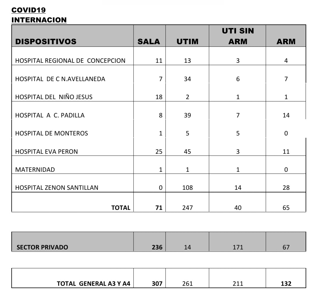 El total de pacientes dados de alta a la fecha es de 23.117 mientras que los casos que permanecen activos son 14.686.Según los últimos datos sobre internaciones brindados por el Ministerio de Salud provincial, encabezado por la doctora Rossana Chahla, son 911 los tucumanos con Coronavirus internados en hospitales y sanatorios: 423en el sector público y 488 en el privado. Por otro lado, se indica que son 132 los pacientes con asistencia respiratoria mecánica (ARM).