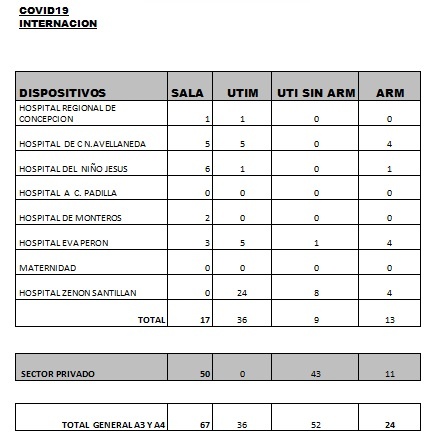 Asimismo se informa el fallecimiento de 2 pacientes, lo cuales estaban siendo asistidos en el público:-Un hombre de 68 años con comorbilidades, internado en terapia intensiva del sector público, con neumonía por Covid-19. -Un hombre de 58 años con comorbilidades, internado en terapia intensiva del sector público, con asistencia respiratoria mecánica, con neumonía por Covid-19.