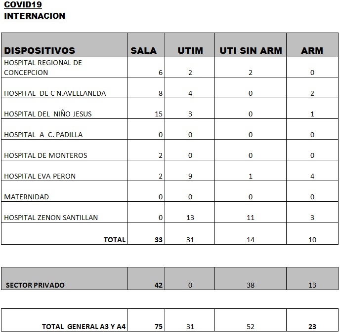 Según los últimos datos sobre internaciones brindados por el Ministerio de Salud provincial, encabezado por la doctora Rossana Chahla, son 181 los tucumanos con Coronavirus internados en hospitales y sanatorios: 88 en el sector público y 93 en el privado. Por otro lado, se indica que son 23 los pacientes con asistencia respiratoria mecánica (ARM).