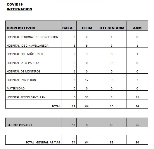 Los casos corresponden a los siguientes departamentos: Capital (160); Tafí Viejo (26); Yerba Buena (24); Lules (14); Cruz Alta (13); Chicligasta (6); Monteros (5); Tafí del Valle (4); Burruyacu (3); Leales (3); Famaillá (2); Alberdi (1); Río Chico (1); Trancas (1). Según los últimos datos sobre internaciones brindados por el Ministerio de Salud provincial, encabezado por la doctora Rossana Chahla, son 286 los tucumanos con Coronavirus internados en hospitales y sanatorios: 119 en el sector público y 167 en el privado. Por otro lado, se indica que son 50 los pacientes con asistencia respiratoria mecánica (ARM). El total de pacientes dados de alta a la fecha es de 76.116, mientras que los casos activos son 3.636