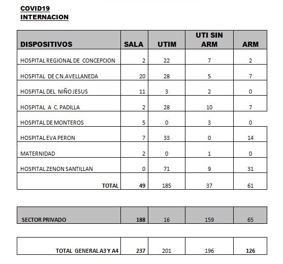 Según los últimos datos sobre internaciones brindados por el Ministerio de Salud provincial, encabezado por la doctora Rossana Chahla, son 760 los tucumanos con Coronavirus internados en hospitales y sanatorios: 332 en el sector público y 428 en el privado. Por otro lado, se indica que son 126 los pacientes con asistencia respiratoria mecánica (ARM). El total de pacientes dados de alta a la fecha es de 48.407, mientras que los casos que permanecen activos son 7.347.