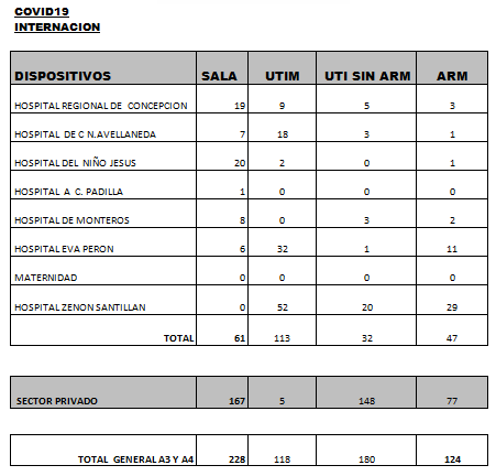 Según los últimos datos sobre internaciones brindados por el Ministerio de Salud provincial, encabezado por la doctora Rossana Chahla, son 650 los tucumanos con Coronavirus internados en hospitales y sanatorios: 253 en el sector público y 397 en el privado. Por otro lado, se indica que son 124 los pacientes con asistencia respiratoria mecánica (ARM). La buena: el total de pacientes dados de alta a la fecha es de 87.339, mientras que los casos que continúan activos son 8848