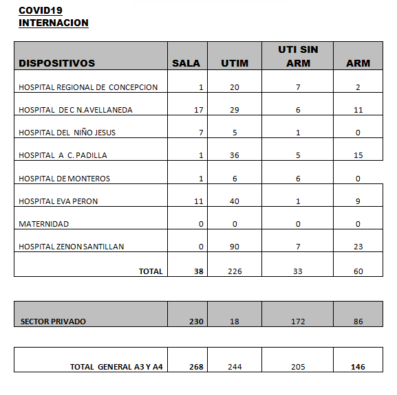 Según los últimos datos sobre internaciones brindados por el Ministerio de Salud provincial, encabezado por la doctora Rossana Chahla, son 863 los tucumanos con Coronavirus internados en hospitales y sanatorios: 357 en el sector público y 506 en el privado. Por otro lado, se indica que son 146 los pacientes con asistencia respiratoria mecánica (ARM).
