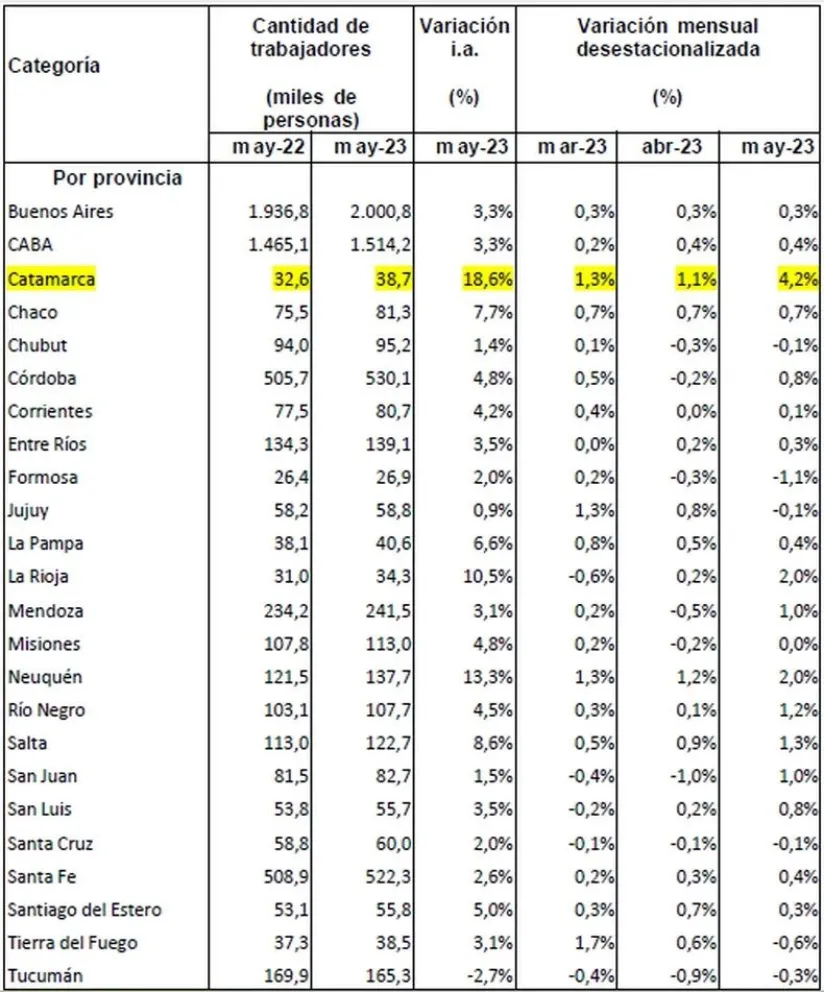En la comparación interanual, 23 provincias lograron aumentar el empleo. Entre las que mostraron mejor desempeño relativo se destacan Catamarca (+18,6%), Neuquén (+13,3%), La Rioja (+10,5), Salta (+8,6%), Chaco (+7,7%), La Pampa (+6,6%), Santiago del Estero (+5%).