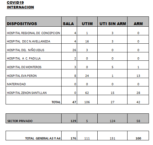 Según los últimos datos sobre internaciones brindados por el Ministerio de Salud provincial, encabezado por la doctora Rossana Chahla, son 538 los tucumanos con Coronavirus internados en hospitales y sanatorios: 222 en el sector público y 316 en el privado. Por otro lado, se indica que son 100 los pacientes con asistencia respiratoria mecánica (ARM) El total de pacientes dados de alta a la fecha es de 81.707 mientras que los casos que continúan activos son 7.362