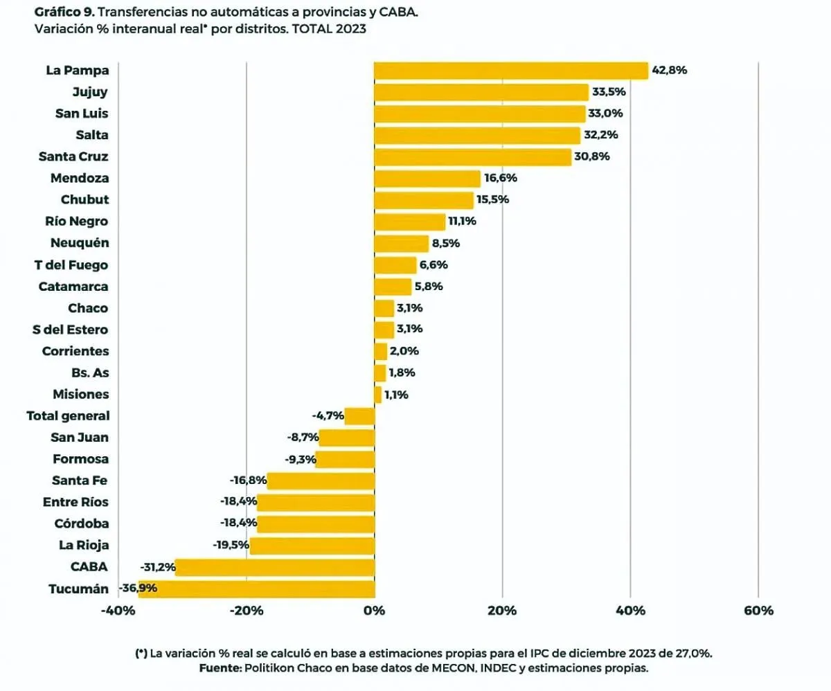 ¿Cómo le fue a Tucumán en ese contexto? Según el diagnóstico, el distrito gobernado por Osvaldo Jaldo terminó diciembre como el segundo con mayor caída real en la transferencia de recursos discrecionales (77,5 por ciento), sólo superado por la Ciudad Autónoma de Buenos Aires (CABA), con una baja real del 79 por ciento.