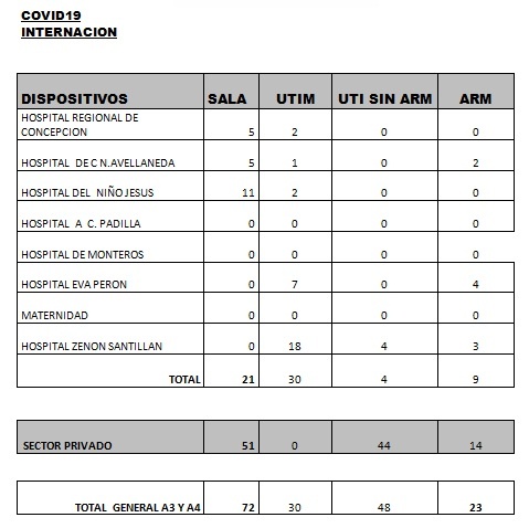 Asimismo, se informa el fallecimiento de una paciente la cual estaba siendo asistido en el sector privado:-Una mujer de 53 años con comorbilidades, internada en la terapia intensiva del sector público, con asistencia respiratoria mecánica, con neumonía por Covid-19.