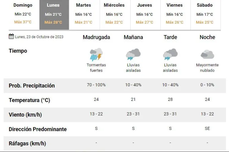 El área será afectada por tormentas de variada intensidad, pudiendo ser algunas localmente fuertes. Se espera que las mismas estén acompañadas por fuertes ráfagas, ocasional caída de granizo, fuerte actividad eléctrica y abundante caída de agua en cortos períodos. Se prevén valores de precipitación acumulada entre 15 y 35 mm, pudiendo ser superados en forma puntual.
