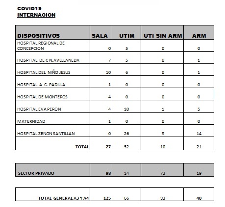 Según los últimos datos sobre internaciones brindados por el Ministerio de Salud provincial, encabezado por la doctora Rossana Chahla, son 314 los tucumanos con Coronavirus internados en hospitales y sanatorios: 110 en el sector público y 204 en el privado. Por otro lado, se indica que son 40 los pacientes con asistencia respiratoria mecánica (ARM).