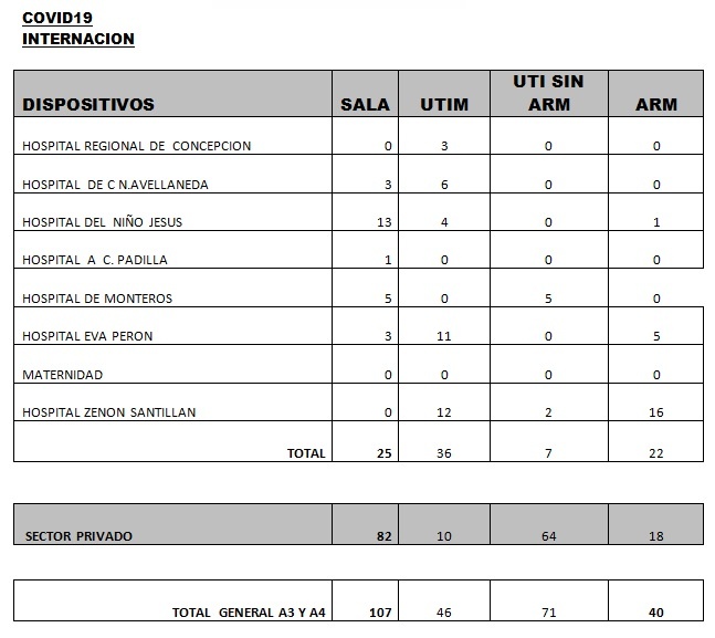 Asimismo, se informa el fallecimiento de 1 paciente el cual estaba siendo asistido en el sector público: -Un hombre de 63 años con comorbilidades, internado en terapia intensiva del sector público, con asistencia respiratoria mecánica, con neumonía por Covid-19.