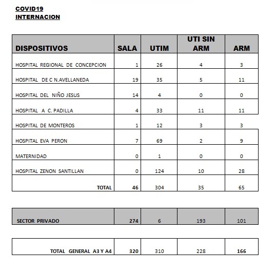 Asimismo, se informa el fallecimiento de 18 pacientes en las últimas 24 horas: -Un hombre de 90 años con comorbilidades, internado en la terapia intensiva del sector privado, con neumonía por Covid-19. -Una mujer de 62 años con comorbilidades, internada con asistencia respiratoria mecánica en la terapia intensiva del sector privado, con neumonía por Covid-19. -Una mujer de 63 años con comorbilidades, internada con asistencia respiratoria mecánica en la terapia intensiva del sector privado, con neumonía por Covid-19. -Un hombre de 76 años con comorbilidades, internado con asistencia respiratoria mecánica en la terapia intensiva del sector privado, con neumonía por Covid-19. -Un hombre de 82 años con comorbilidades, internado en la terapia intensiva del sector privado, con neumonía por Covid-19. -Una mujer de 94 años con comorbilidades, internada en la terapia intensiva del sector privado, con neumonía por Covid-19. -Una mujer de 78 años con comorbilidades, internada en la terapia intensiva del sector privado, con neumonía por Covid-19. -Un hombre de 75 años con comorbilidades, internado con asistencia respiratoria mecánica en la terapia intensiva del sector público, con neumonía por Covid-19. -Un hombre de 91 años con comorbilidades, internado en la terapia intermedia del sector público, con neumonía por Covid-19. -Un hombre de 72 años con comorbilidades, internado en terapia intensiva del sector público, con asistencia respiratoria mecánica, con neumonía por Covid-19.