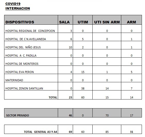 Según los últimos datos sobre internaciones brindados por el Ministerio de Salud provincial, encabezado por la doctora Rossana Chahla, son 245 los tucumanos con Coronavirus internados en hospitales y sanatorios: 112 en el sector público y 133 en el privado. Por otro lado, se indica que son 31 los pacientes con asistencia respiratoria mecánica (ARM). El total de pacientes dados de alta a la fecha es de 75.685, mientras que los casos activos son 3.491