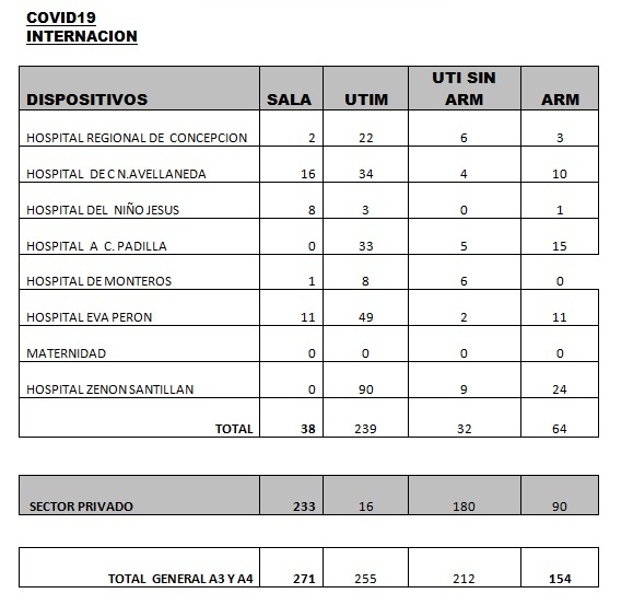Según los últimos datos sobre internaciones brindados por el Ministerio de Salud provincial, encabezado por la doctora Rossana Chahla, son 892 los tucumanos con Coronavirus internados en hospitales y sanatorios: 373 en el sector público y 519 en el privado. Por otro lado, se indica que son 154 los pacientes con asistencia respiratoria mecánica (ARM). El total de pacientes dados de alta a la fecha es de 42.306., mientras que los casos que permanecen activos son 9.834.