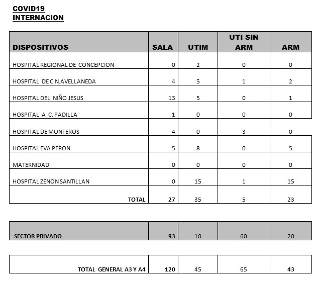 Según los últimos datos sobre internaciones brindados por el Ministerio de Salud provincial, encabezado por la doctora Rossana Chahla, son 273 los tucumanos con Coronavirus internados en hospitales y sanatorios: 90 en el sector público y 183 en el privado. Por otro lado, se indica que son 43 los pacientes con asistencia respiratoria mecánica (ARM). El total de pacientes dados de alta a la fecha es de 65.132 mientras que los casos que permanecen activos son 2.090