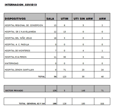 Según los últimos datos sobre internaciones brindados por el Ministerio de Salud provincial, encabezado por la doctora Rossana Chahla, son 610 los tucumanos con Coronavirus internados en hospitales y sanatorios: 257 en el sector público y 353 en el privado. Por otro lado, se indica que son 111 los pacientes con asistencia respiratoria mecánica (ARM).