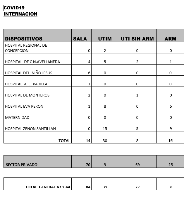 Asimismo se informa el fallecimiento de un paciente, el cual estaba siendo asistido en el sector público: -Un hombre de 74 años con comorbilidades, internado en la terapia intensiva del sector público, con asistencia respiratoria mecánica, con neumonía por Covid-19