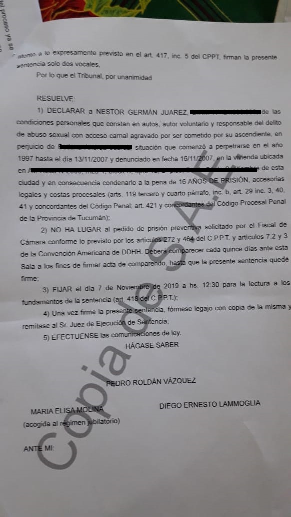 B.A.R, denunció a su progenitor Néstor Germán Juárez en 2007 por abusos sexuales que comenzaron en 1997. A pesar de haber sido declarado culpable y condenado a 16 años de prisión por abuso sexual con acceso carnal agravado en 2019, el imputado continua en libertad.