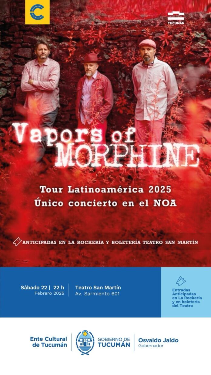 Las entradas están disponibles en https://culturadetucuman.entradanet.com/tc-events/vapors-of-morphine-sabado-22-02-2025-21-00hs/