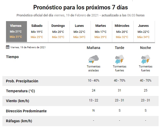 De acuerdo al pronóstico extendido, mañana sábado la temperatura registrará un marcado descenso, con una mínima de 19º y una máxima de 25º. Sin embargo, el domingo dará un salto y la máxima llegaría a los 33º, en lo que será el día más caluroso de la semana. Sin embargo, será un fin de semana con el cielo mayormente nublado y probabilidad de lluvias y tormentas.