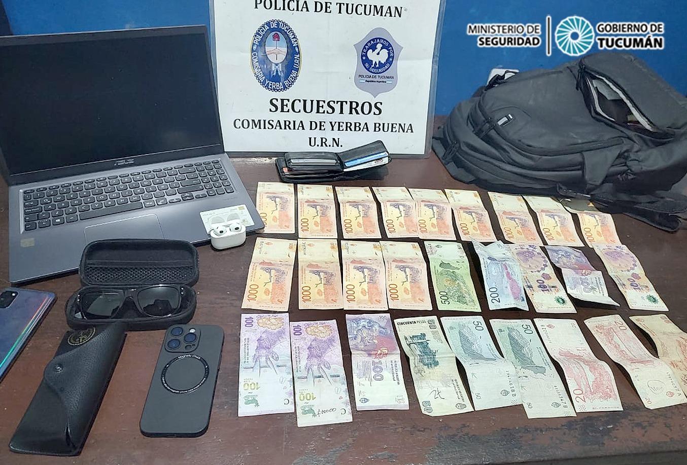 Uno de ocupantes de la camioneta produce el robo a otro vehículo que estaba estacionado y se dio a la fuga, mientras que las otras dos personas quedaron en el vehículo y no pudieron escapar gracias al trabajo de los efectivos de Distritos Urbanos Diez. Los equipos de la Comisaría de Yerba Buena y de la Patrulla Motorizada, desplegaron un operativo cerrojo en la zona y finalmente aprehendieron al otro sujeto y secuestraron las pertenencias de la víctima. Recuperaron $100.000, notebook, anteojos, dos celulares que pertenecían a la víctima”, explicó el comisario inspector Walter Colombres, Jefe de zona Dos de la Unidad Regional Norte