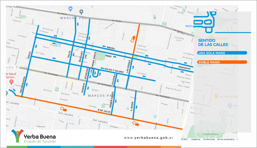 Sentido Norte-Sur:-Salta entre Avenida Perón y Aconquija-Acassuso desde Salas y Valdez hasta Aconquija-Lola Mora Oeste desde Perú hasta Aconquija-Rubén Darío desde Aconquija hasta Boulevard 9 de Julio Sentido Oeste-Este-Perú desde Roca hasta Bartolomé Hernández.